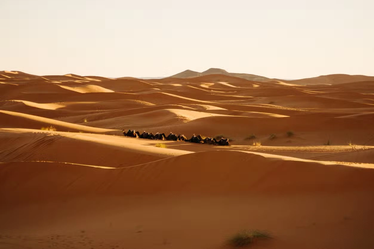On the second day of our Morocco desert Tour, we start with a delightful breakfast, preparing to explore the Dades Gorges. As we travel, we’ll pass through vibrant Berber villages in the Dades Valley, with the breathtaking sight of a thousand kasbahs dotting the landscape. Upon reaching Tinghir, known for its lush palm grove, our journey continues to the awe-inspiring Todgha Gorge. We’ll have lunch on our way to Erfoud. When we arrive in Merzouga, your camels will be waiting for you. Today, you’ll ride the camels to the desert camp, where you’ll spend the night under the stars.